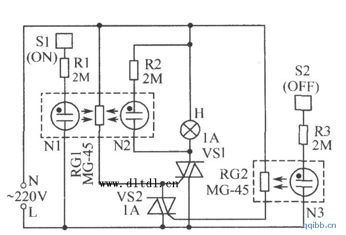 电路原理如图所示,氖管N1、N2与光敏电阻RG1构成光电耦合器。当用手指触摸金属片S1时,N1发光,使RG1阻值变小,于是双向晶闸管VS1因获得足够的触发电流而导通,故灯泡H得电而点亮。与此同时,H上的220V交流电压使N2发光,此光线当然也照在RG1上,所以这时,即使触摸停止,VS1仍然保持在导通的状态,即H仍然保持点亮。图中氖管N3和光敏电阻RG2构成另一个光电耦合器。H点亮后,如果触摸金属片S2,则N3发光,使RG2阻值变小,双向晶闸管VS2因获得足够的触发电流而导通,使VS1因其G极与T1极短接而截止,H熄灭。综上所述:触摸一下S1,H点亮;再触摸一下S2,H熄灭;如此周而复始。N1、N2、N3用启辉电压为60V左右的氖管,灯泡的功率要小于100W,S1和S2为铜片,大小为5mm×5mm。其他元器件无特殊要求。整个电路结构简单,只要装焊无误,不用调试即可正常工作。