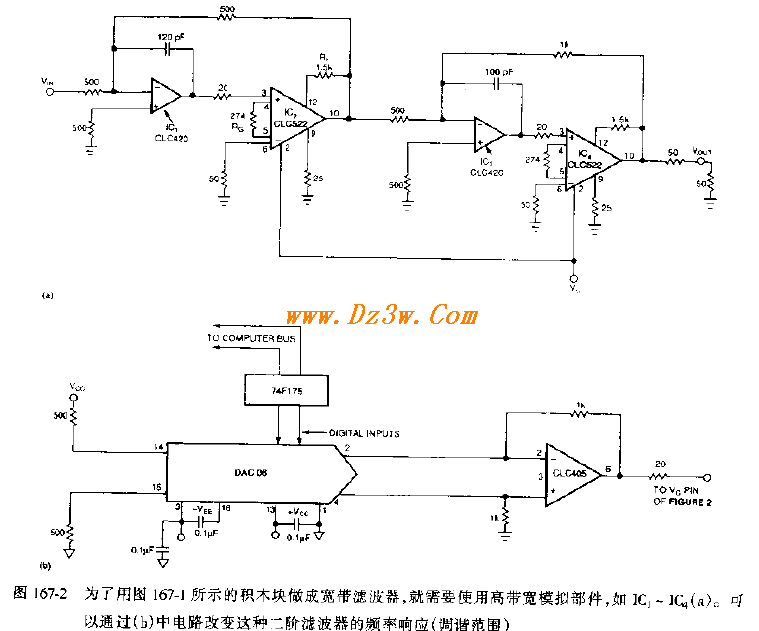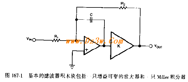 具有宽带调谐范围的有源滤波器电路图 下图所示的是一种利用基本运算放大器和高速模拟元件构成的具有优异相位线性度的二阶频率可变低通滤波器(图167-2)电路,图167-1中滤波器部分包括紧随增益可变放大器(具有全反馈电阻器R2)之后的一只Miller积分电路。总直流增益为R2/R1 〕 ,电路的传递因式为: