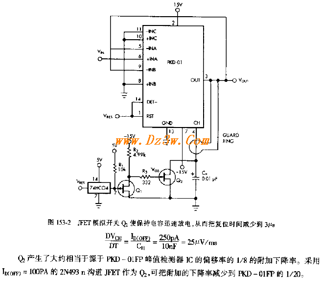 减少峰值检测器复位时间的模拟开关电路 图153-l的原理图是一种采用ADI公司的PKD-01FP单片峰值检测器的单位增益峰值检测器的基本配置。复位时间tres是保持电容器Ch放电所需要的时间。tres和采集时间 t ^ ro 是tacq的IC输出电流能力的函数。由于CH=10nF,这个电流的限制把tres和tacq 都置定在大约220us。