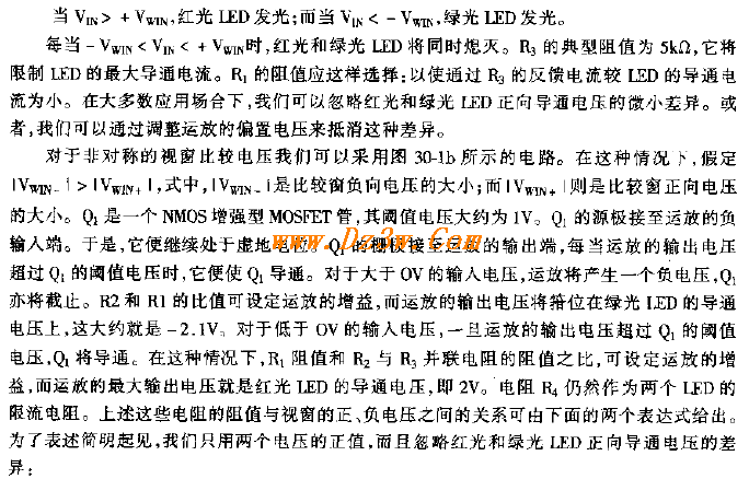 本电路使用了一个场效应晶体管( FET )输人端、低偏移电压的 OPA124 运放和一个双色的发光二极管(LED)。LED的红光和绿光的正向导通电压分别为2V和2.1V 。运放的反馈电阻R1和R2的阻值应这样选择:以使运放的闭环增益(1+R2/R1)能等于Vled/Vwin,式中,Vwin乃是所需的视窗比较电路正向电压或负向电压的阂值。这样,每当输人电压Vin的大小超过正负Vwin时,运放级使输出一个电压,使相应的LED点亮。