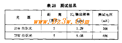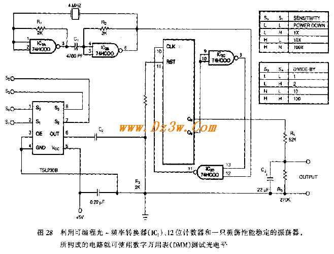 光信号测量电路 图 28 所示的电路允许你利用普通数字电压表测量光电平,TSL230B(IC1)是一只可编程光-频率转换器,此转换器的输出频率正比于光信号强度。输入S0和S1把IC1的灵敏度设定为 lx 、 10 x 或100x 。S2和S3控制着内部可编程分压器(见图 28 中的表),当S0为高值时, S1,S2,S3就为低值,1V输出等于1mV/cm^2的光辐射度。