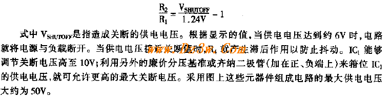此电路使用了一只LM4041型可调的分压调整器作为电压检侧器。当电路作为基准运行时,LM4041型器件在其正、负端产生一个电压,该信号迫使经过R1的电压等于1.24v 。但是在这个电路中R3阻止了这种伺服作用。利用电路中的R3,当经过R1的电压小于1.24v 时,Vc就近似接地,而当经过 Rl 的电压大于1.24V 时, Vc 大约为 lv ,低于正端电压。因此,通过选择合适的R1和R2值就能设定一个电压阀值。当供电电压超过阀值时Vc就变高,因此而截断Ql ,并使电源与负载断开。按照下式就可选择R1和R2的大小: