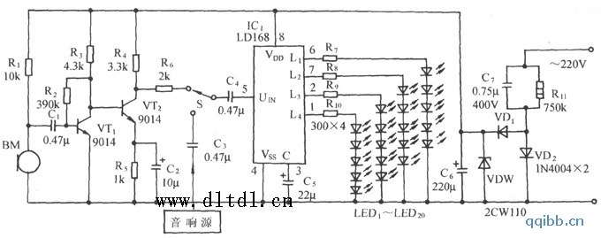 图中,LD168是一种为收录机闪光音箱作声级指示的专用集成电路。它有四路输出,可直接驱动多个发光二极管,也可驱动可控硅器件带动彩灯发光。