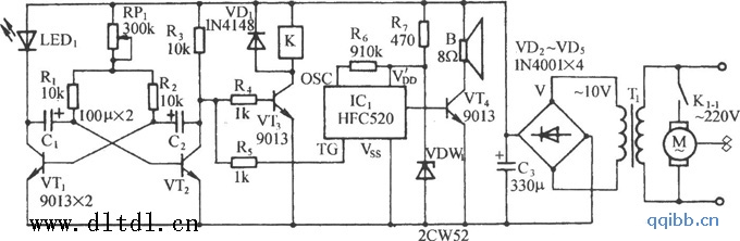 电路如图所示。它由可变频率多谐振荡器、继电器控制电路、模拟海浪声电路和交流降压整流电路等组成。将普通电风扇配置上该控制电路后,不仅可使风扇的风量一阵大、一阵小,具有自然风的特点外,还同时伴随有逼真的海浪声,在享受阵阵凉风的同时,具有大自然的感受。VT1,VT2和C1,C2,R1~R3,RP1等组成一个多谐振荡器。由于振荡器电路不完全对称,电路极易起振。调节RP1可改变其谐振频率,其振荡频率为: