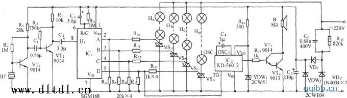 如图所示,它是以音频压控彩灯控制集成电路5GM168为核心,配以鸟鸣发声和音放电路,组成音频压控彩灯及鸟鸣发声电路。