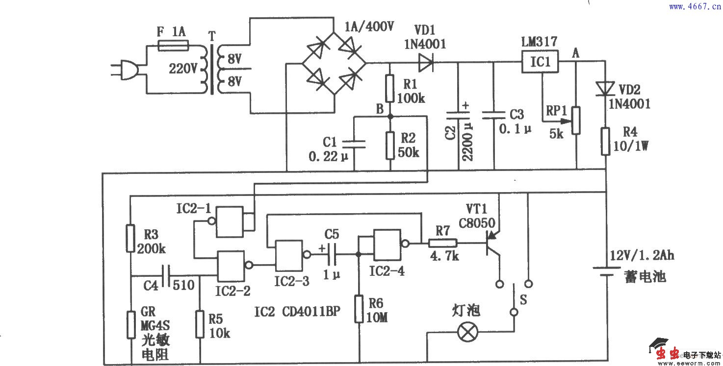 全自动多用途应急灯电路图 全自动多用途应急灯的电路如图所示。平时应急灯接通市电,处于充足电备用状态。当突然停电而且周围环境光线突然由强变弱时,它能智能判断出这是由于断电引起的黑暗,并及时点亮应急灯。经过10min后应急灯会自动关闭,这时人员一般已经撤离到安全地点,无需再提供照明,关闭应急灯还可以防止过度放电损坏铅酸蓄电池。