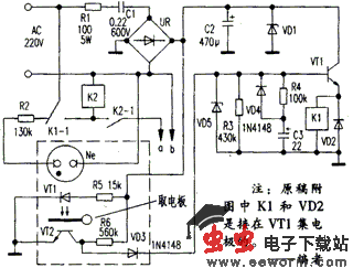 当带钥匙的取电板插入房间取电卡槽时,阻断了发光二极管至光敏三极管VT2的光路,VT2因无光照而截止,集电极输出高电平。整流桥UR输出的正电源,经电阻R6、二极管VD3加至三极管VT1基极,VT1导通。继电器K1吸合,K1-1常开触点为交流接触器K2接通市电。交流接触器K2吸合,K2-1接点闭合,经a、b接通房间供电电路,房间内照明灯亮。当客人离开房间拔出钥匙电板时光敏三极管接收到发光二极管的光而导通。VT2集电极为低电平,二极管VD3截止,继电器K1经延时(约1分钟)后释放,K1-1常开接点断开,交流接触器K2释放,其常开触点切断房间供电电路,房间内照明灯灭。同时K1-1的常闭接点接通,使取板处的氖泡点亮,以便在暗中指示取电板卡的方位。