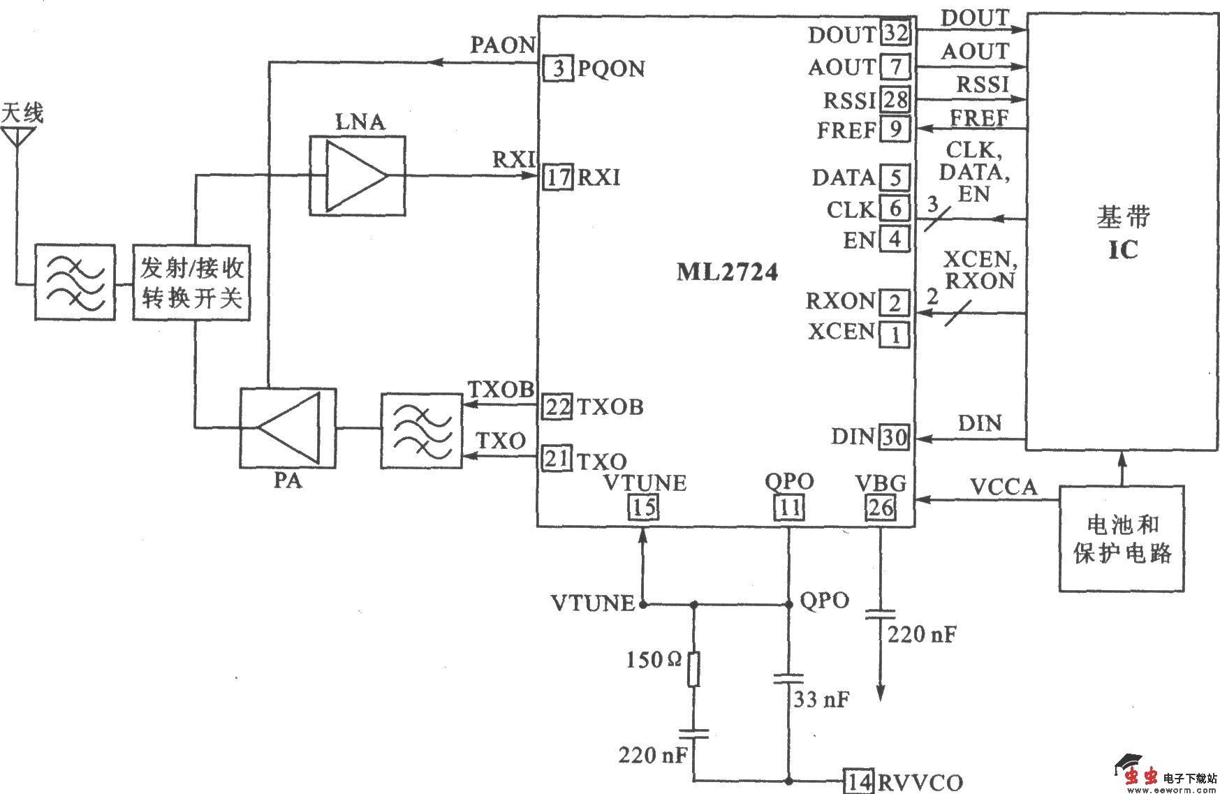 ML2724是具有自动调谐和闭环调制等功能的收发器,适合在数字无绳电话、无线PC外设、无线游戏操作和无线移动媒体中应用。 主要技术特点如下: ·工作频率为2.4~2.485 GHz; ·FSK调制/解调方式; ·数据传输速率为l.5 Mb/s; ·灵敏度为-90 dBm; ·输出功率为3 dBm; ·工作电源为2.7~3.8 V; ·有3线制控制接口,模拟信号强度指示输出。