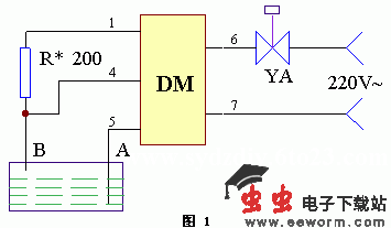 该装置应用电路工作原理如图1。它可用于家庭自来水自动灌啊。现在城市用水比较紧张,高层建筑上的住户用水就更加困难,常常是只有到了半夜待别人家不用水了,才有少量的水被压上高楼来,但人要睡觉,不能老是守候灌水,采用本电路则大可放心地支睡觉。当水池中的水位低于探针B时,有电流从控制器DM的①端经电阻R流入④端,控制器开通,电磁阀YA励磁吸合,打开水龙头。当有水被压上来时就自动流入水池中。一旦水污染灌足,其水面达到探针B的高度时,B、A探针间的电阻与R分压,使控制器④端电压低于1.6V,故YA失电释放,水龙头自动关断。这样第二天早晨起来就不愁没水用了。其中A、B探针可用不锈钢制作。