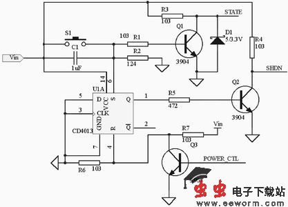 实际设计的自动开/关机电路如图1所示。其中U1A为双D触发器CD4013,外接电池电源由Vin输入。Q输出通过阻值为472W的R5、103W的R4和NPN型三极管Q2反向驱动后,与开关电源芯片的开关引脚相连。以MAX1626为例,当SHDN为高时关闭电源,SHDN为低时打开系统电源。