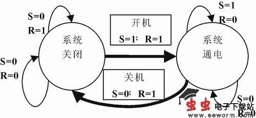 当RC网络的延迟时间过后,S端由1转为0,此时S=0,R=0,查阅真值表得出此时输出Q应该维持前一输出状态,即保持系统开通电源状态。