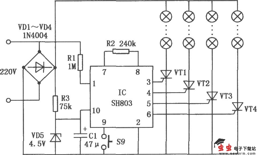 由SH803模块构成的彩灯控制电路如图所示。它具有8种功能,可以通过人工或自动控制,使发光二极管或各种彩灯产生千姿百态、变幻无穷的闪亮,用于门面店铺的灯光装潢、节日彩灯装饰以及摩托车尾箱和汽车刹车等的灯光装饰。