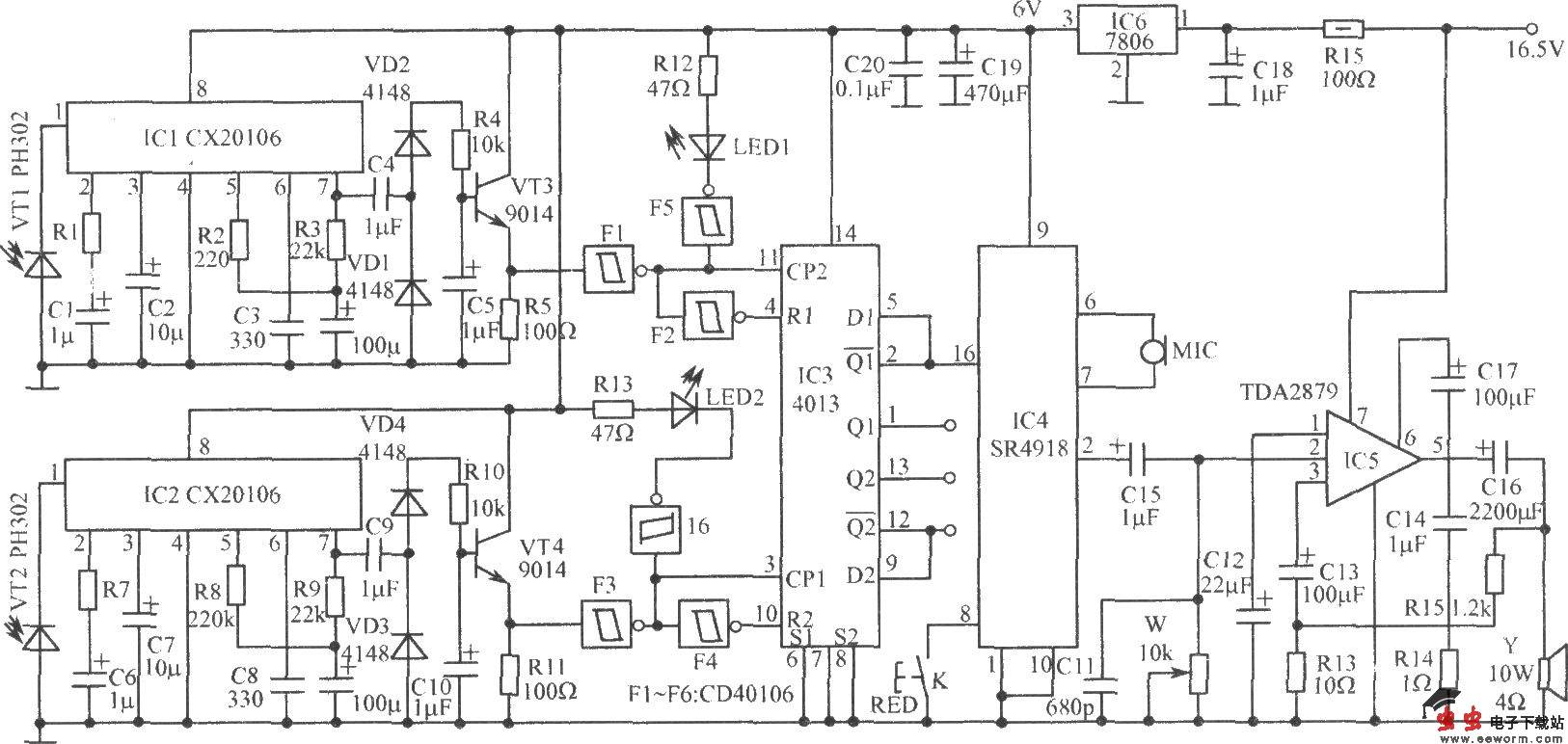 该电路采用红外光作主动光源,如装在大门口,在红外线照射区域内,当有人走过遮挡了红外线时,能自动判断人是走进还是走出,进而发出相应的语音提醒,完成语言执勤的任务。例如:有人进入油库重地,会提醒“严禁烟火”;进入旅游区,能劝告“爱护公物,注意卫生”;进入宾馆、超级市场,则敬告“欢迎光临”;当来客离开时,可喊出“再见”。该电路适于需要语言服务的公共场所和特定区域。它由红外发射电路和红外接收电路组成。红外发射电路: