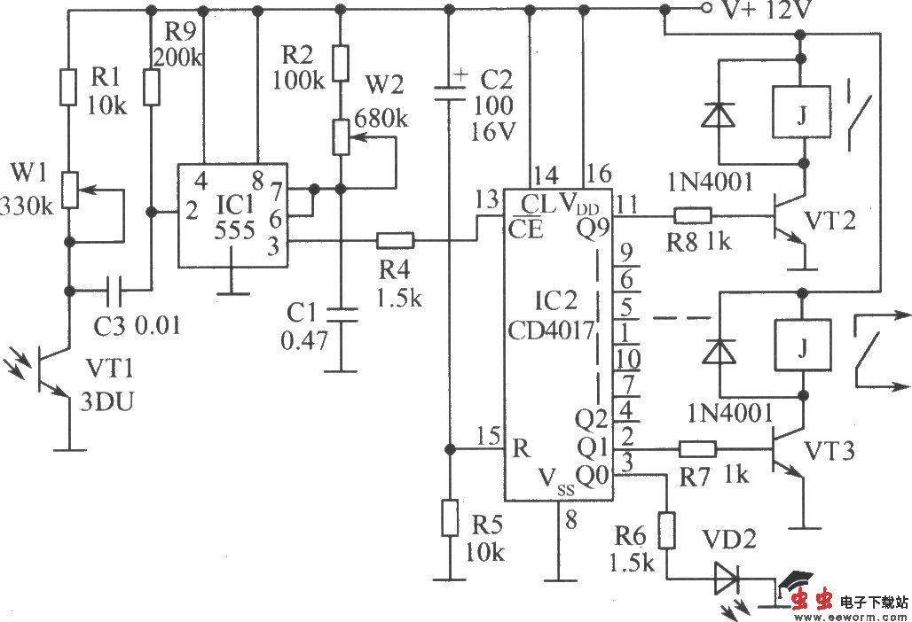 如图所示是连续闪光摄影控制电路,它可实现主闪光灯闪光一次,带动其余9个闪光灯依次闪光,然后进入等待状态,等待下一次主闪光灯动作,这样可以自动连续完成10次摄影。元器件选择:IC1选择555时基电路,IC2选择CD4017集成电路。VT1选择应使暗阻与亮阻的比值较大的3DU光敏三极管,这样可以提高电路的可靠性;VT2与VT3选择3DG型三极管。其他元件无特殊要求。 觉得这篇文章有帮助吗?