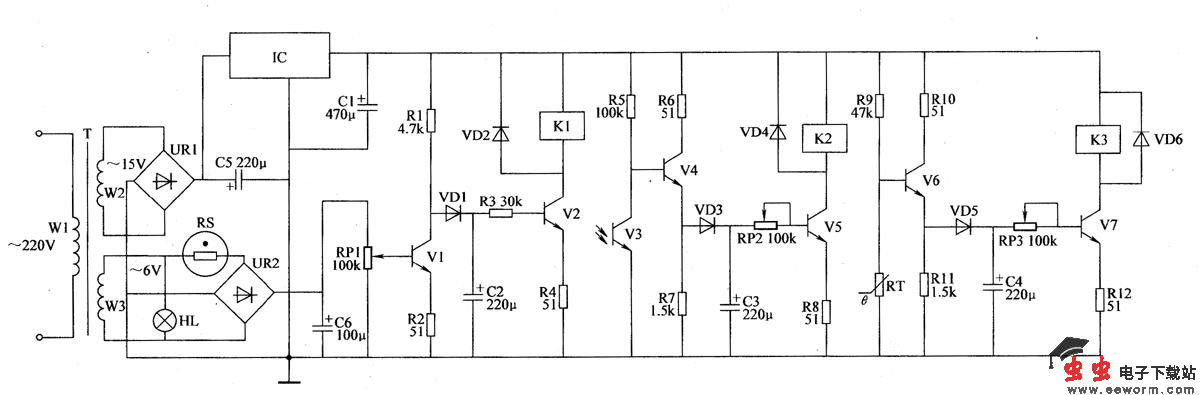 交流220V电压经T降压后,分别在W2绕组和W3绕组上产生交流15V电压和交流6V电压。交流15V电压经UR1整流、IC稳压及C1滤波后,为整机提供12V直流电压;交流6V电压经RS限流降压及UR2整流后,加在RP1两个固定端上。