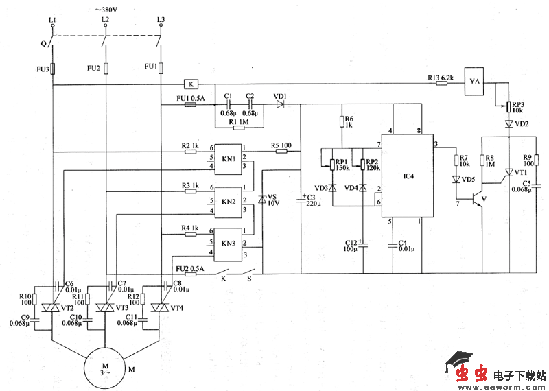 接通刀开关Q和控制开关S后,继电器K通电吸合,其常开触点接通,相线L2、L3上的交流电压经C1和C2降压、VD1整流、VS稳压及C3滤波后,为IC提供+10V工作电压。+10V电压还经R5为KN1~KN3提供工作电压,使KN1~KN3内部的发光二极管和光敏晶闸管导通,VT2~VT4受触发导通,电动机M通电运转。