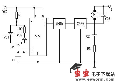 这是一个占空比可调的脉冲振荡器。电机M是用它的输出脉冲驱动的,脉冲占空比越大,电机电驱电流就越小,转速减慢;脉冲占空比越小,电机电驱电流就越大,转速加快。因此调节电位器RP的数值可以调整电机的速度。如电极电驱电流不大于200mA时,可用CB555直接驱动;如电流大于200mA,应增加驱动级和功放级。