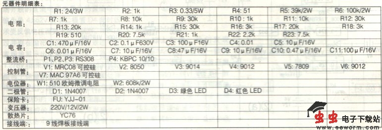 这块电路板电路简单,成本不高,制作容易,电路作简单分析:220V交流电经变压器T降压,P2整流,V5稳压得到9V直流电压,为四运放集成芯片LM324提供工作电源。P1整流输出是提供直流电机励磁电源。P4整流由可控硅控制得到0-200V的直流,接电机电枢,实现电机无级调速。R1,C2是阻容元件,保护V1可控硅。R3是串在电枢电路中作电流取样,当电机过载时,R3上电压增大,经D1整流,C3稳压,W1调节后进入LM324的12脚,与13脚比较从14脚输出到1脚,触发V7可控硅,D4 LED红色发光管亮,6脚电压拉高使V1可控硅不能触发,保护电机。电机过载电流大小由W1调节。市电过零检测,移相控制是由R5、R6降压,P3整流,经4N35隔离得到一个脉动直流进入14脚,从8脚到5脚输出是脉冲波,调节W2电位器即调节6脚的电压大小,可以改变脉冲的宽度,脉冲的中心与交流电过零时刻重合,使得双向可控硅很好地过零导通,D4是过载指示,D3是工作指示,W2是电机速度无级调节电位器。电路制作好后只要元件合格,不用调整就可使用。我从100W-1000W电机都试过,运行可靠,调节方便,性能优良。