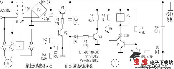 电路原理如图1所示,由于水路本身就是一个良好的接地体,因此本电路把水路和地阻作为三极管V2、V3、V6偏置电路的一部分。将电源正极接地后,各电极只需一根导线即可完成对有关三极管的触发,工作原理读者不难自行分析。图中C3、C4为抗干扰电容,防止电极b、c的引线从控制器向屋顶水箱的走线过程中,与照明电网的相线并行而感应出电流进入V3、V6基极,使电路无法正常工作。本电路只要参照电路图选择合格元件,并正确安装即可使用。图中J1是小型继电器,J是交流接触器。