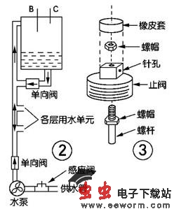 供水系统的改装如图2所示。只要按图改装即可。下面介绍一下各电极的制作与安装,这关系到电路能否正常工作。来水感应阀制作方法如下: