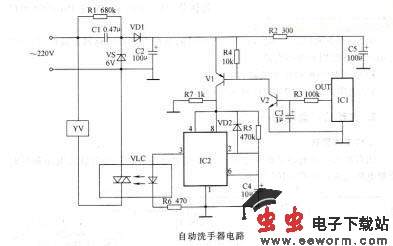 电路中,电源电路由电容器cl、C2、电阻器Rl、稳压二极管vs和整流二极管VD1组成;红外检测控制电路由电阻器R2一R7、电容器C3一C5、二极管VD2、晶体管vi、V2、热释电红外传感器集成电路ici和时基集成电路IC2组成;控制执行电路由光祸合器VLC和电磁阀YV组成。交流220V电压经cl降压、vs稳压、VDI整流及C2滤波后,为红外检测控制电路提供6V直流电压。