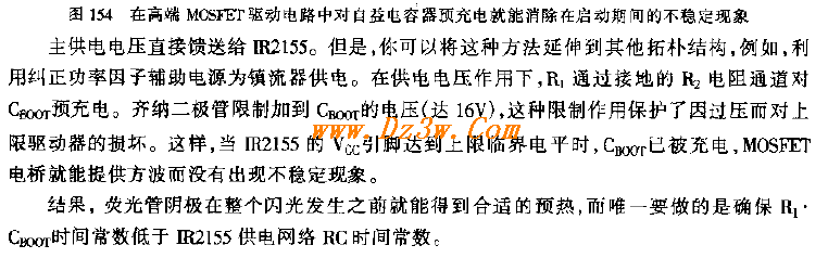 在高端MOSFET驱动电路中,当使用一只高压电桥驱动器时,如IR2110或较新型的IR2155 .完整的驱动电路在加上电压时就会出现不稳定的现象。电容器上,就是说,这种电容器在加上电压时会产生放电。这样主要问题出在自益,飘动的电压无法实现其驱动高端 MOSFET的主要功能。这种电路需要少量变换以便对自益电容器进行迅速充电,以允许其对上限驱动器供电。