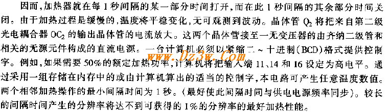 图 135 所示的电路可用来对小容积的物体进行精确的重复温度控制。本电路可提供高的分辨率,并在控制电路与电源线路之间的有效的隔热。该电路不产生射频干扰,具有足够的控温速度,还能提供热源发出的平均热功率与数字输人码之间的线性关系。本电路的工作原理是通过产生若干可编程的触发脉冲去供给与加热器串联的二端双向可控硅开关元件。我们可以设定脉冲数在 O 到 99 之间。图 135 所示的电路是按220V,50Hz电源标准构置的,但也可修改元件的参数值以适应其他地区的电源标准。