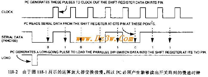负载输入脚上的输人脉冲的下降沿将 8 位并行愉入信号传送给移位寄存器,接着,这些位以输出脉冲上升沿方式在时钟输人脚上析出。移位寄存器上的串行输人脚与5V相连,但也可以用它级联多个移位寄存器、Tx和Rx信号驱动比较器