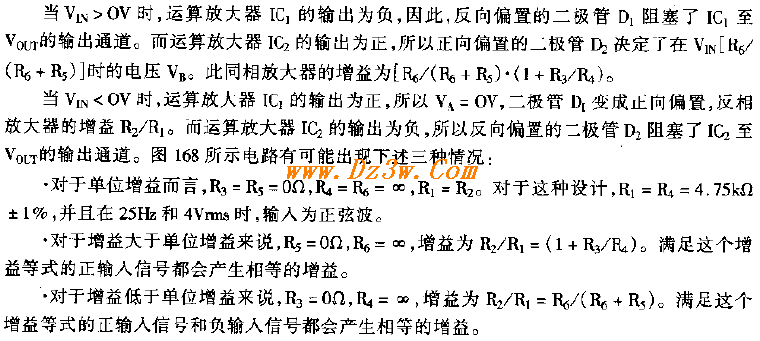用两只运放构成快速全波整流器电路 图 168 所表示采用运放LF444CN运放组成的精密全波整流器的电路, 其主要的特性如下: · 在输人和输出(在链路中只有一只运算放大器)之间具有最小的延迟时间; · 正输人和负输人延迟时间相似; · 不需要匹配二极管或调整电阻器。