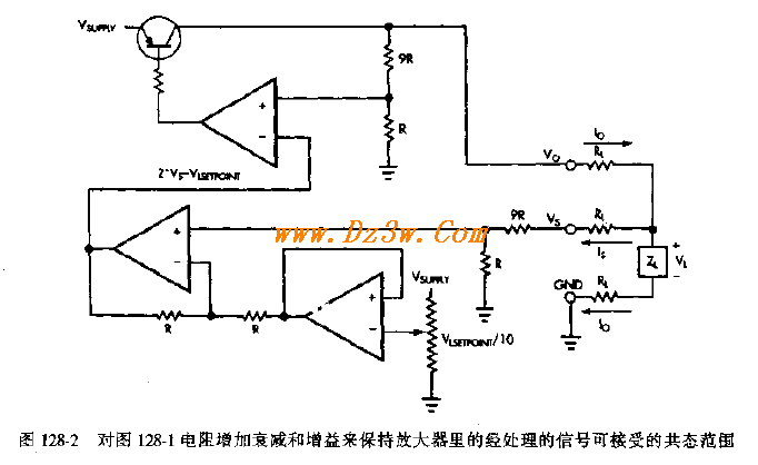 用户可能不得不随着输出控制回路中的附加增益来降低传感电压和控制电压以便为放大器(图128-2 )中经过处理的信号保待一个可接受的共态范围。务必注意在传感电路中保持高阻抗。在调节供电电压有足够适应性的范围内,这个电路随电缆中导线电阻的变化(如由热产生的变化)而保持适当的工作。