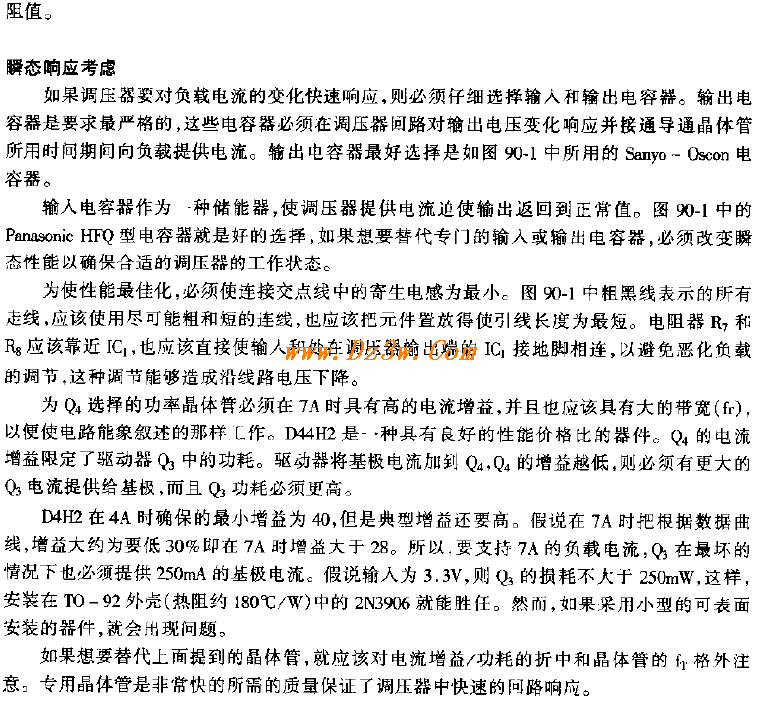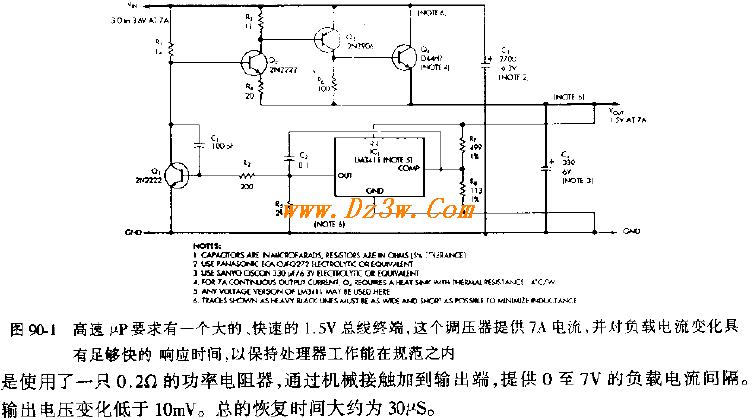 3.3V转1.5V大电流线性稳压电源电路 一些最新的高性能处理器要求电流高达7A的1.5V总线终端。这个终端需要非常快的瞬态响应,因为该装置必须对具有极快上升时间的高峰电流变化作出反应。图90-1 所示的1.5V 终端电路就能满足这些要求。该电路是一种输人3.3V而输出为1.5V,7A的线性调压器。其主要目的是需达到低成本、精度调压和快速瞬态响应。