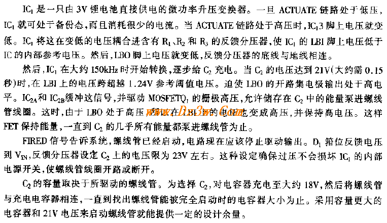 用3V 电池驱动9V螺线管的低功耗电源电路 时下,很有必要通过低压电池对便携设备中螺线管式脉冲衰咸器供电。图 88 中的电路采用 10uA 备份电流就能完成这一任务。设计中利用了这样一个事实,即螺线管在高于它们的正常电压下会通过电容放电实现衰减。这种工作模式通过螺线管短路器产生优良的直接的响应。