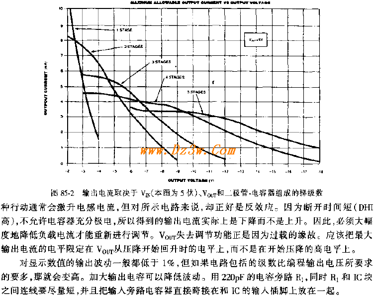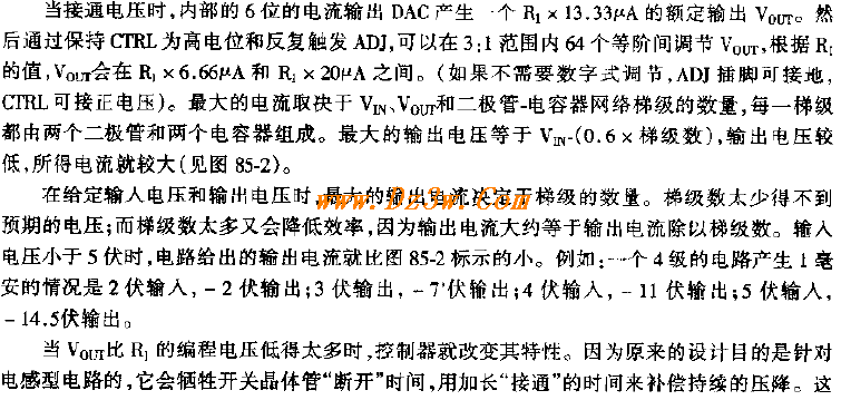 不用电感的负电压生成电路图 开关式电源控制器加上一个二极管及电容器网络,不要电感器就能生成运算放大器或 LCD 偏压所籍要的小的负偏压电流。图 85-1 所示的电路采用 2 至 6 伏的输人,产生一个数字式可调的输出电压。二极管一电容器电荷泵由DHI和DLOW的开关作用来驱动,而通常在电感型开关电源里是驱动一个外部的MOSFET或PNP三极管。