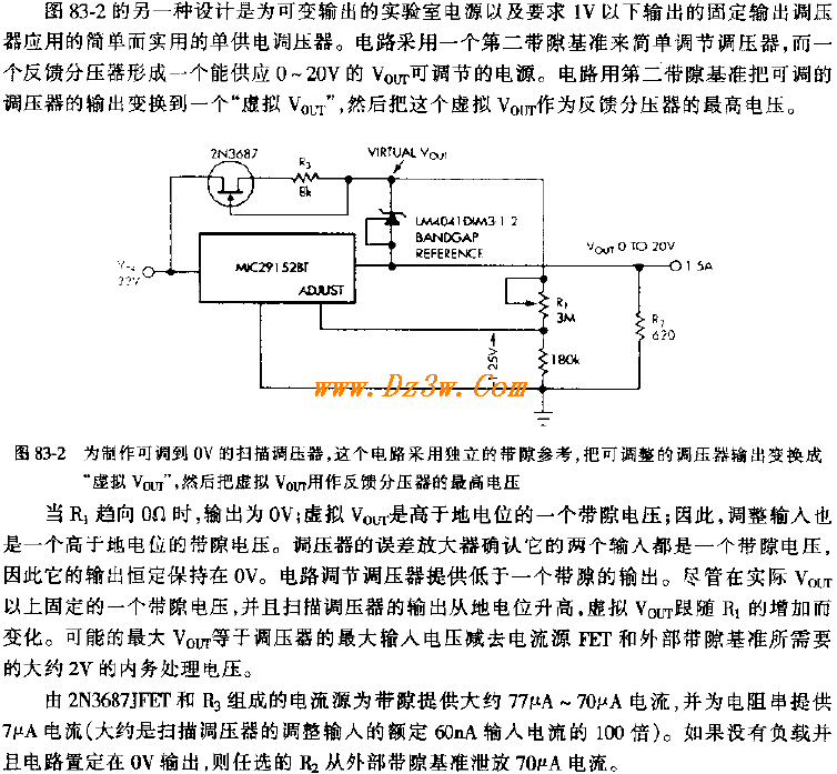 可调电压扫描调压器在正常情况下使输出能在某一最大Vout和一个不接地的带隙电压之间无限调节。供给误差放大器的内部带隙参考限制最小输出电压。一些调压器有通用的.恒定的接地电流使你能把扫描调压器“浮”在可调电阻的上面。这个设计要求具相对高的静态电流以淹投扫描调压器的接地电流。其它调压器有专用的高输人阻抗调整的输人,因而有较低的静态电流。图83-l给出了两个供选择的标准设计。这些设计都可得到能迅速而便于调整的调压器,但它们的输出决不会低于l.25V,这正是存在于 IC 内部大多数半导体带隙基准的 O 温度系数点的电压。