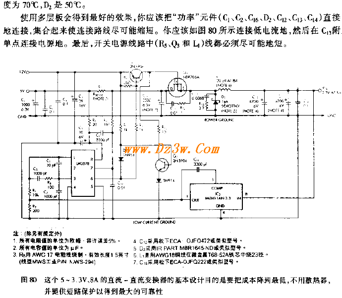 图80的电路能提供8A电流,可供驱动两个现代的高性能、高速度的微处理器。用户还可以通过改变几个部件得到更小的电流使设计最佳化。大多数系统采用低电流12V偏压电源和调节性能不是很好的大电流的5V电流为逻辑电路供电。然而,微处理器要求3.3V 作为它主供电电压。因而,一个有效的能把5V变换成3.3V 并且提供严格稳压输出的dc/dc变换器是必要的。这种电路基本设计目标是把成本降到最低,不用散热器,但仍能提供短路保护以达到最大的可靠性。一个工作在80kHz的降压调压器提供3.3V/8A 输出。 IC1 通过Q1和Q2门驱动晶体管来驱动主开关晶体管-N沟道Q3。为了使开关损耗降到最小,快速开关转换给Q3的栅极提供有效的驱动是必要。