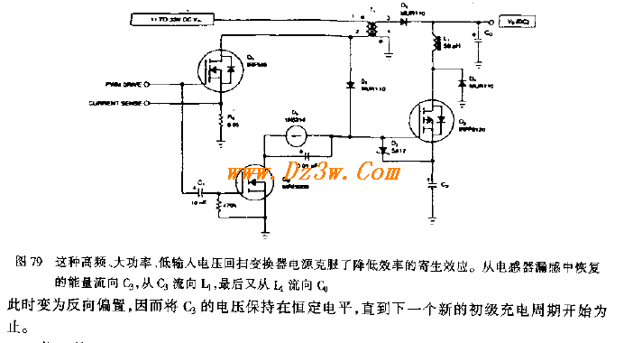 图 79 所示的漏感复能电路恢复初级漏感中存储的能量,并把恢复了的能量变成电源的输出的一部分。从理想的状态说,能量的传输应当完全是无功,即无损耗的。在该电路里,恢复了的能量从电感器的漏感电流变换成C3的电压,从C3 的电压又变成L1的电流,又从L1的电流变成C0的电压。