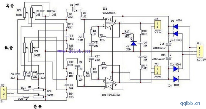 TDA2030A是单声道的功率放大集成电路,做立体声放大器必须使用两只TDA2030A。TDA2030A只有五只引脚,正电源、负电源、正向输入、反向输入和输出。TDA2030A的散热片是和负极连通的,用双电源供电时,散热片千万不要和地线短路。