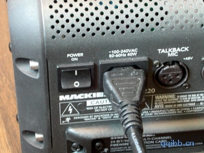 D-Sub上面就是所有的输出接口了,包括前4个通道的效果器插入接口,ALT3/4输出、ControlRoom输出和主输出,其中主输出为XLR接口,另外还可以单独连接一个话筒作为对讲使用。旁边的电源接口使用了Mackie自己研发的独特技术,可同时支持220V和110V。Onyx1220的包装里提供了2种电源线,分别适合110V和220V的地区使用,也就是说你带着Onyx1220环游世界也不必担心电源不兼容的问题。
