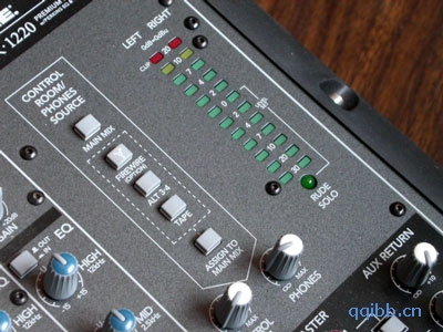 Onyx1220的推子和旋钮的手感非常棒,推子为60mm标准长度,据说旋钮经过了长达2个月的设计时间,盲人也可以轻松操作。我尤其喜欢Onyx1220均衡、声像这种调节到中心位置能感觉出停顿的手感,停顿的感觉即不生硬,又能保证你可以将旋钮放在标准的中心位置,如果那些MIDI控制器的旋钮都像Onyx1220一样简直就太棒了。Onyx1220每个推子旁都有一个4段的小电平表,电平是否过载一目了然。