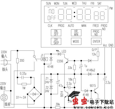 本文介绍的时间控制电子定时器采用一体化可编程时钟集成电路而成,控制电流高达16A,是一种功率较大的可编程序的时间控制器,适用于日常生活中的音响、空调、电饭锅、电灯等家用电器的定时控制,实现对没有定时装置家电的定时控制。 本电子定时器每天有8个程序(4开和4关)供任意编辑;有两种可供选择的星期模式;1天编辑(即按设定1~8次每天连续工作),1周编辑(即周日到周六连续七天或一周中连续、不连续的若干时间段自由定义开或关各一至八次)。使用者可根据定时控制负载的需要任意编辑定义,做到随心所欲。 本电子定时器的主机耗电极省,只需两节纽扣电池便可供电,正常走时为一年时间。机内含有较大容量的电源储备,当纽扣电池无法供电时,定时器仍能维持几分钟时间,确保所设置的时间、程序不丢失。使用液晶显示屏,正常工作时能显示标准时间、程序编号及光标指示星期。 本定时器自身带有插头、插座,工作时只需将其插入家中的插座,再将相关电器插入本装置的插座即可,操作极为方便。 本定时器可方便通过面板输入,设置相关时间。面板参考见图。