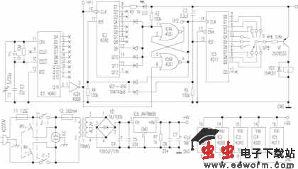 由下图可见,首先按动轻触开关AN,变压器T得电工作,IC6输出+9V电压,作为本机工作电源。C3、R5组成微分电路,在开机时形成一个复位脉冲,使IC3、IC5清零复位。同时继电器得电吸合,使电路自锁。R7是泄放电阻,在定时器工作结束时,使C4、C5的电荷迅速放电。
