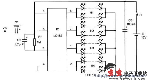 由LC182构成的音响设备装饰电路原理如图所示。它利用音响设备中的12V直流电源,供给电路工作,可将众多的发光二极管置于音响设备的面板或适当部位(如音箱等),一旦放出音乐,发光二极管群就随音乐节拍而闪烁,随音乐幅度而改变闪烁速率。合上电源开关S后,IC内部的压控振荡器便开始工作,如果没有音乐放出,IC的四路输出端依次变为高电平,其循环频率为0.5~1Hz,此时可见彩灯串是慢悠悠地循环闪光。一旦音乐声放出,彩灯串的循环速度随输入音频信号的幅度大小而加快,最大调制率可达15倍,即由原来的1Hz加快到15Hz。适当地调整R和C2的数值可以控制无调制信号加入时的循环速度。当输入的音频信号电流过大时,宜在VIN端串入一只限流电阻。所用发光二极管的个数视驱动电流而定,颜色自选。