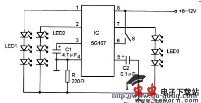 由5G167构成的音箱装饰彩灯串控制电路原理如图所示。IC所用电源可以利用音响设备上的8~12V直流电源。LED1~LED3是三路发光二极管群。R是限流电阻。S是发光顺序方向控制开关。C1确定闪光频率范围,其C1值越大,LED的发光速率越低。在C1上并联电阻可以提高发光速率。当S开路时,LED的光闪顺序为1→2→3??;当S闭合时,LED的光闪顺序为3→2→1??。也可以利用逻辑电路来输出高、低电平控制S,以实现光闪顺序的自动转换。R为220Ω时,电源电压为8~12V,每路至少可串接3只发光二极管。当电源电压高于12V,而LED的个数不变时,应适当增大R阻值。V+每升高2V,可将各路串接的发光二极管数量增加1只。