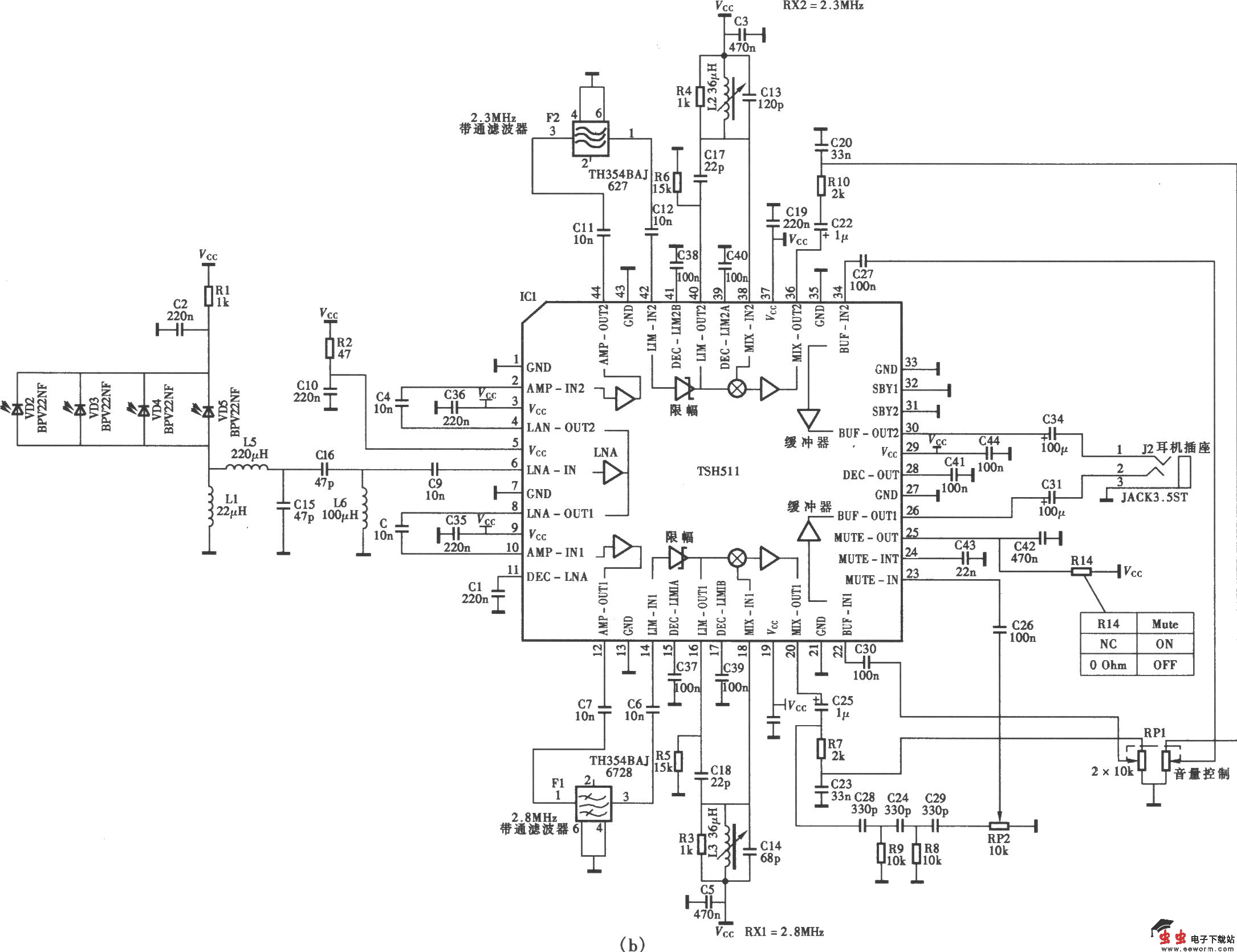 采用TSH5111/ TSH5112红外立体声耳机电路(二) (b)接收电路