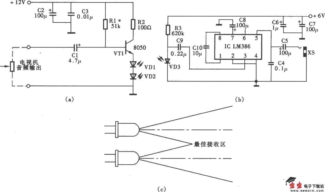 简易红外线无线耳机电路 (a)发射器电路图;(b)接收部分电路图;(c)红外线发光二极管辐射范围