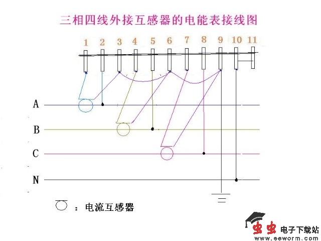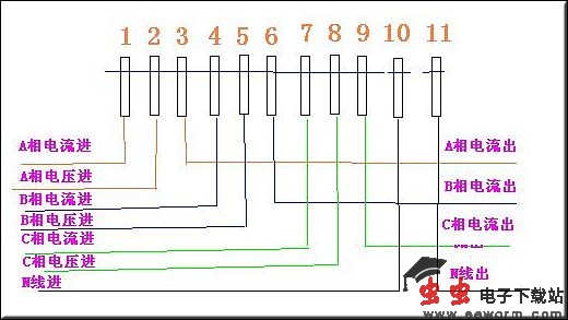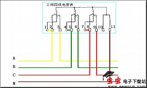 其中1、4、7接电流互感器二次侧S1端,即电流进线端;3、6、9接电流互感器二次侧S2端,即电流出线端;2、5、8分别接三相电源;10、11是接零端。为了安全,应将电流互感器S2端连接后接地。 注意的是各电流互感器的电流测量取样必须与其电压取样保持同相,即1、2、3为一组;4、5、6 为一组;7、8、9 为一组。 不带电流互感器的三相四线电表接线图 带电流互感器的三相四线电表接线图