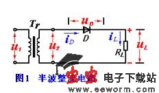 它由电源变压器Tr整流二极管D和负载电阻RL组成,变压器的初级接交流电源,次级所感应的交流电压为