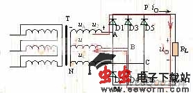 单相整流电路的功率一般不超过一千瓦,对于大功率的整流电路则需要采用三相整流电路,因为大功率的交流电源是三相供电形式。图是一个电阻负载三相桥式整流电路,它有六个二极管,D1、D3、D5接成共阴极形式,共阴极用P表示;D2、D4、D6接成共阳极形式,共阳极用M表示;零线用N表示。