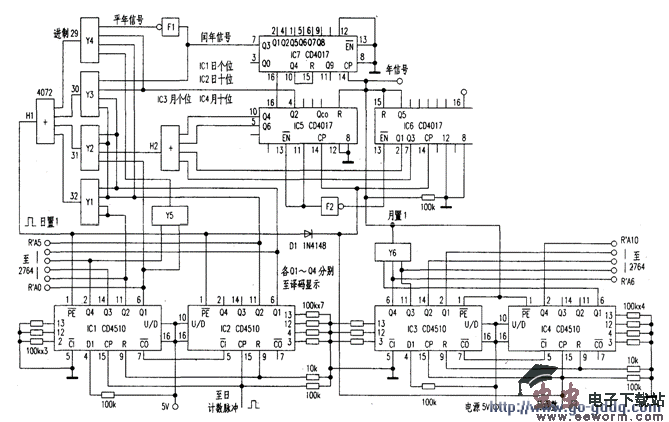 图中1C1、IC2组成日计数电路,IC3、IC4组成月计数电路。IC5、IC6组成13进制计数分配器,与或门H2产生月小的四、六、九、十一月的信号。IC7的Q3产生每四年一闰年信号,非门F1产生平年信号。与门Y6产生月置l信号(即年信号)。日计数器ICl的BCD码输出端。Q2与IC2的Q1、Q2经与门Yl组成32进制,产生月大的(1、3、5、7、8、lO、12131日之后的置l脉冲;ICl的Ql与IC2的Ql、Q2及或门H2组成31进制,产生月小的(4、6、9、11)30日之后的置1脉冲: