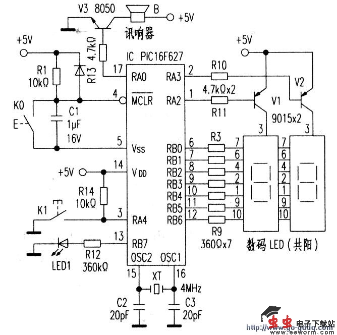 vl、V2是开关管,为LED数码管提供工作电压,在软件动态扫描时,控制Vl、V2开或关。RB7通过电阻R12与LEDl相连,该LEDl作为电路正常工作的显示信号(每秒闪亮一次)。RA4外接上拉电阻R14和按键开关K1,Kl具有复用功能,它既是管理倒计时器99分~00分的时间设置,也是倒计时器工作的启动开关。RAO外接的R13、V3和讯响器(电子市场易购件)组成报讯器电路,若设定时间到,由V3驱动讯响器B工作。